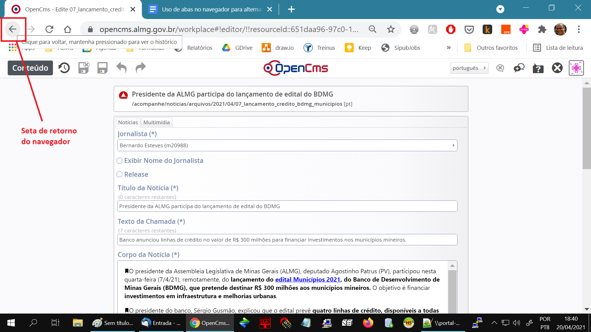 Uso de abas no navegador para alternar entre exibição e edição de conteúdo