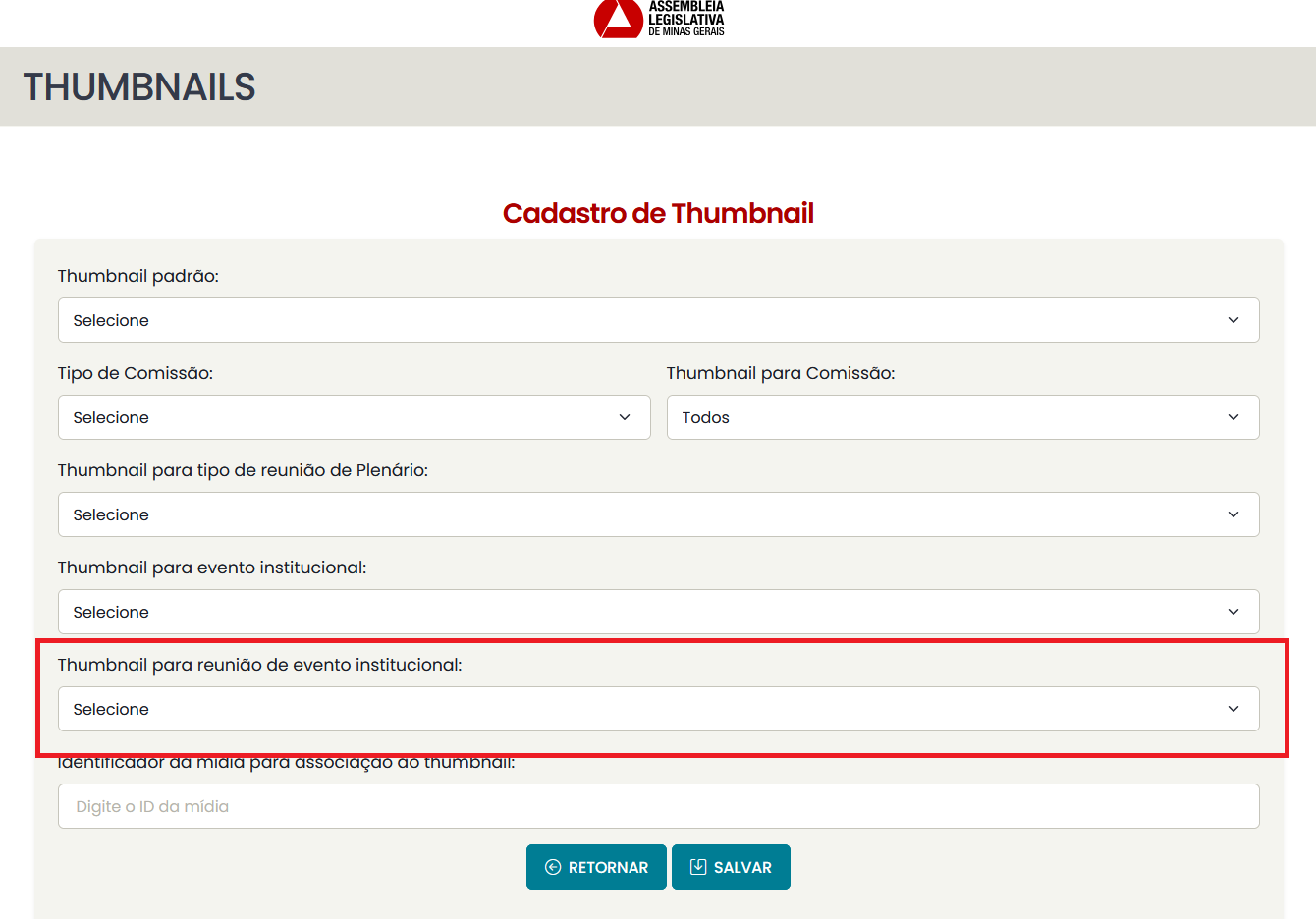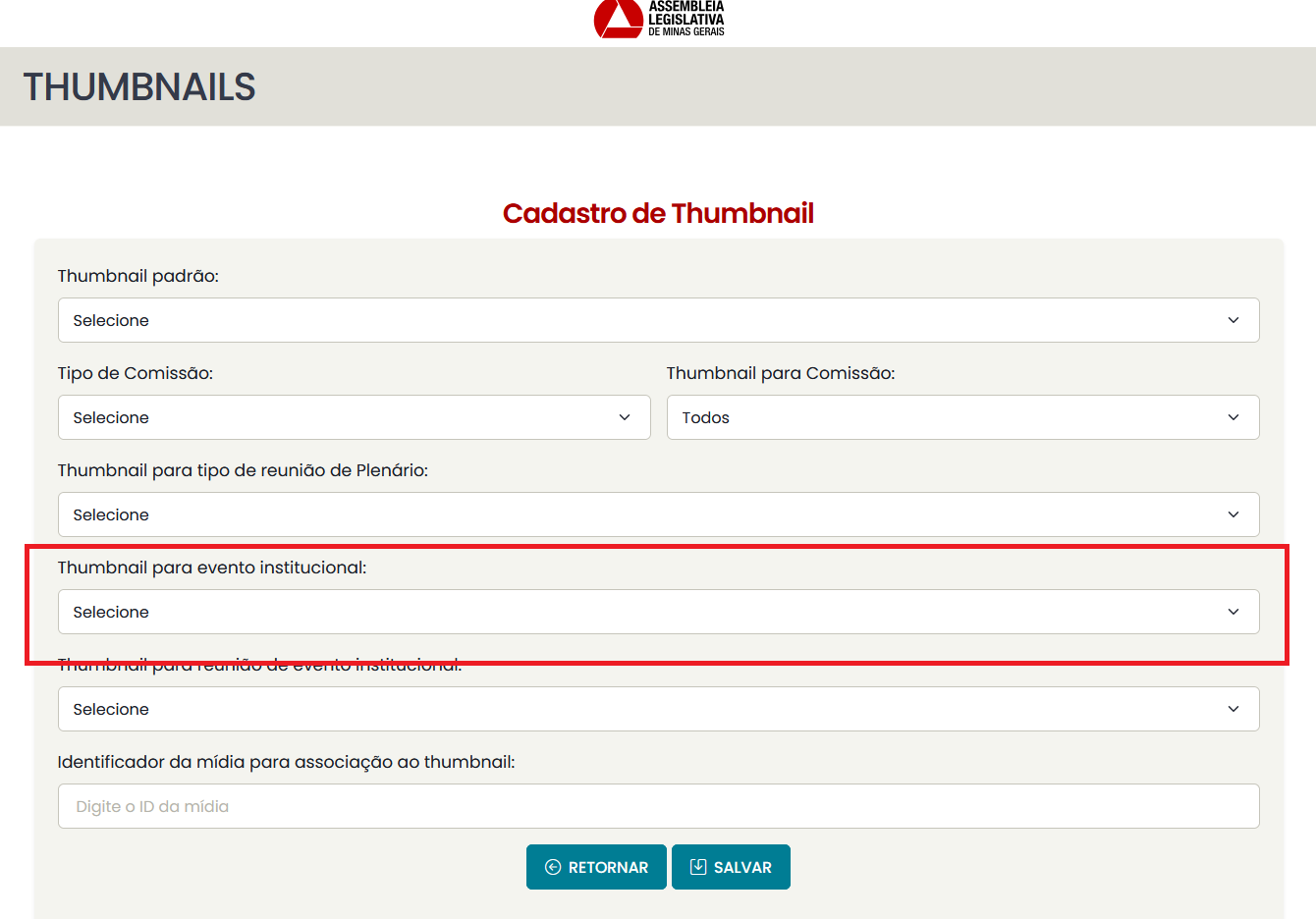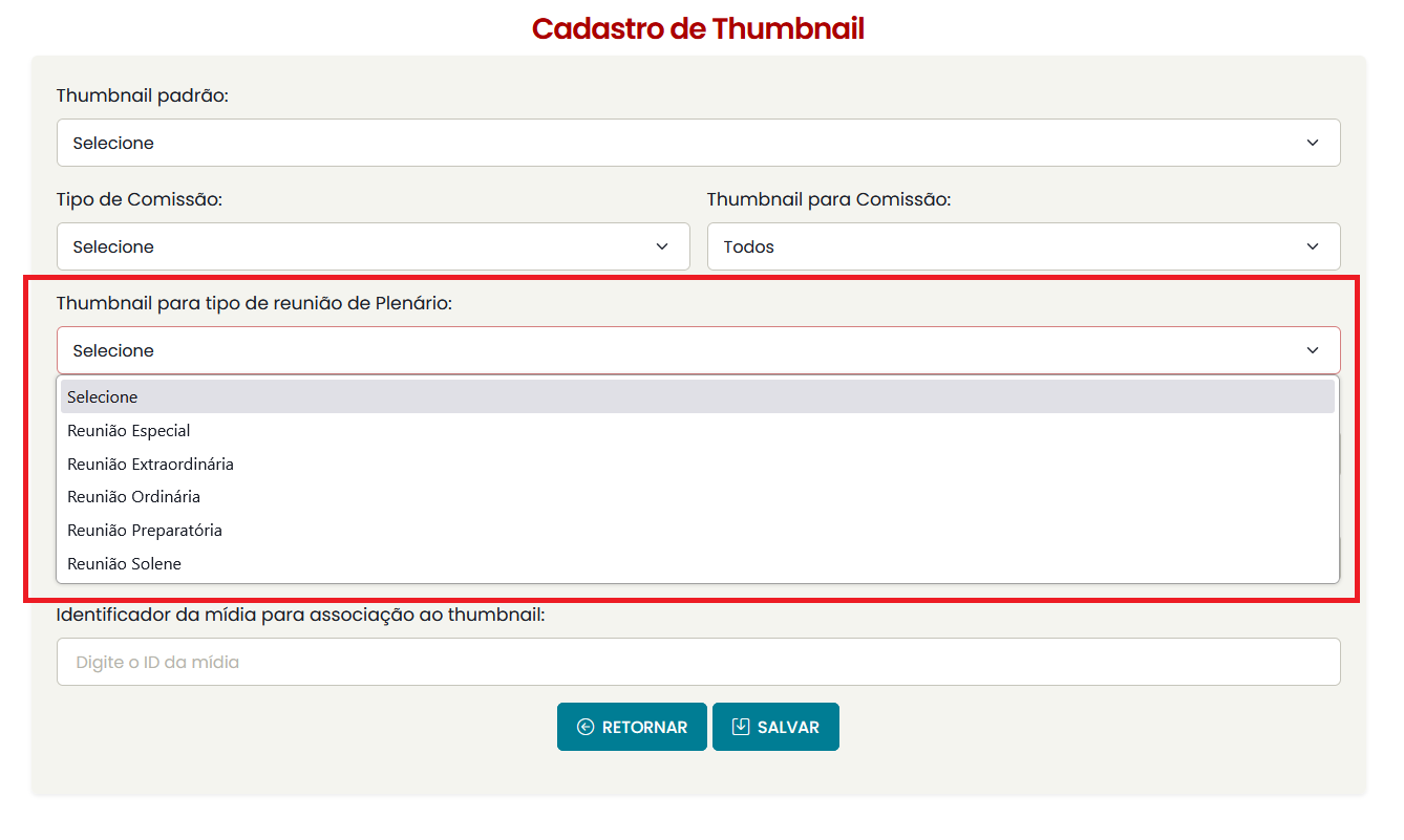 - Thumbnail geral de plenário: se cadastrada, todos os vídeos de reuniões de plenário sem uma associação específica serão associados a essa thumbnail.