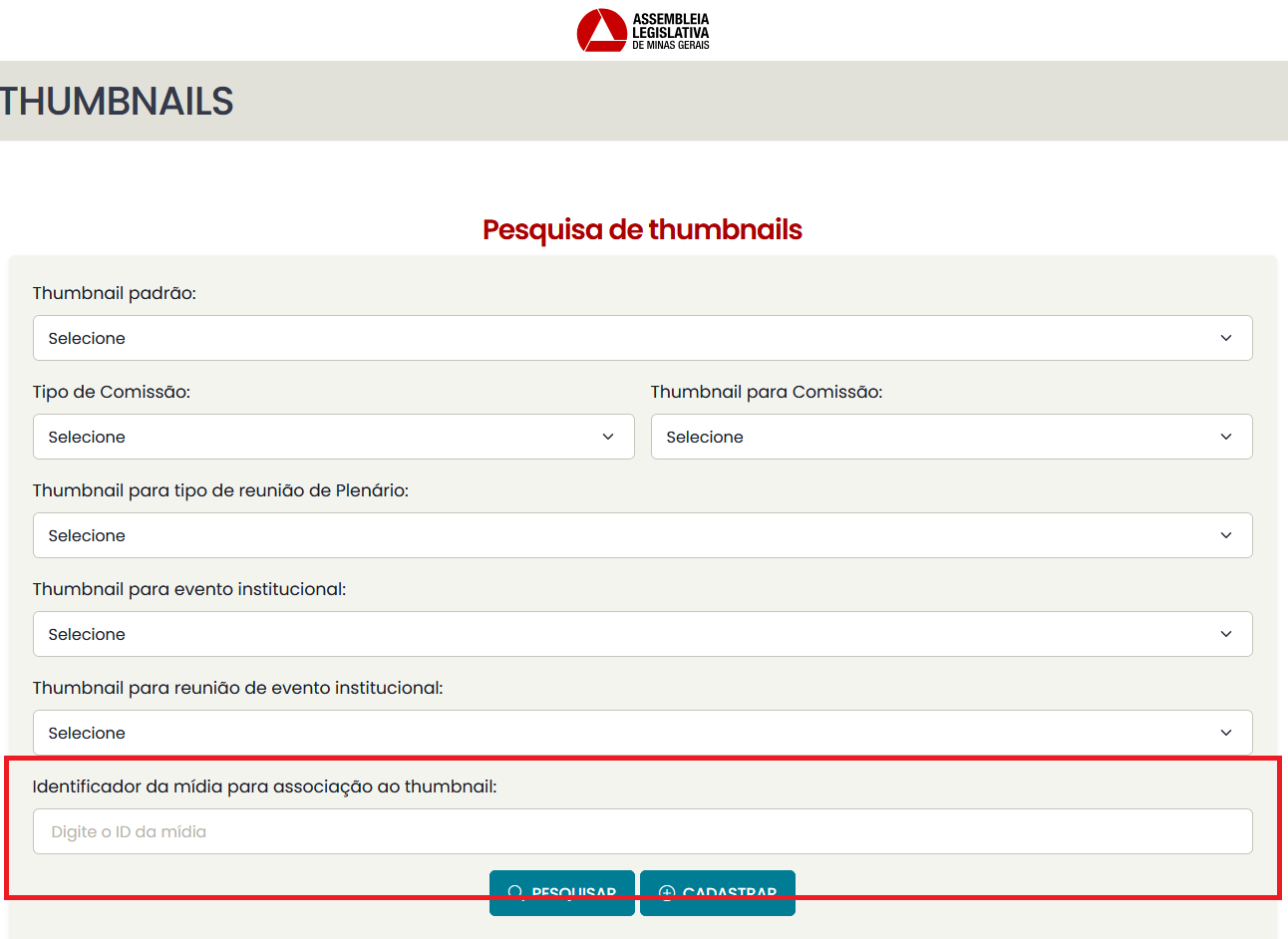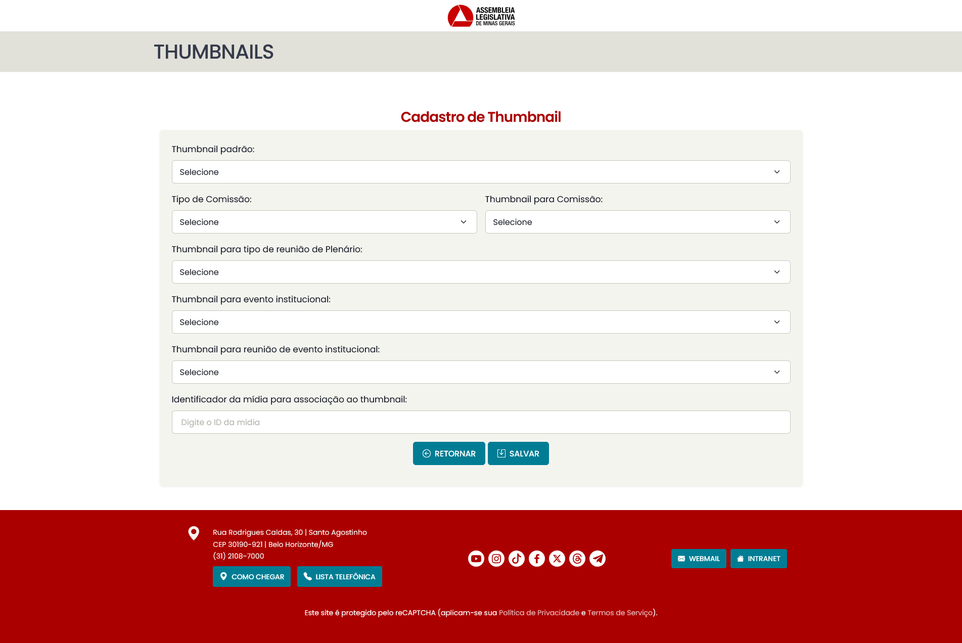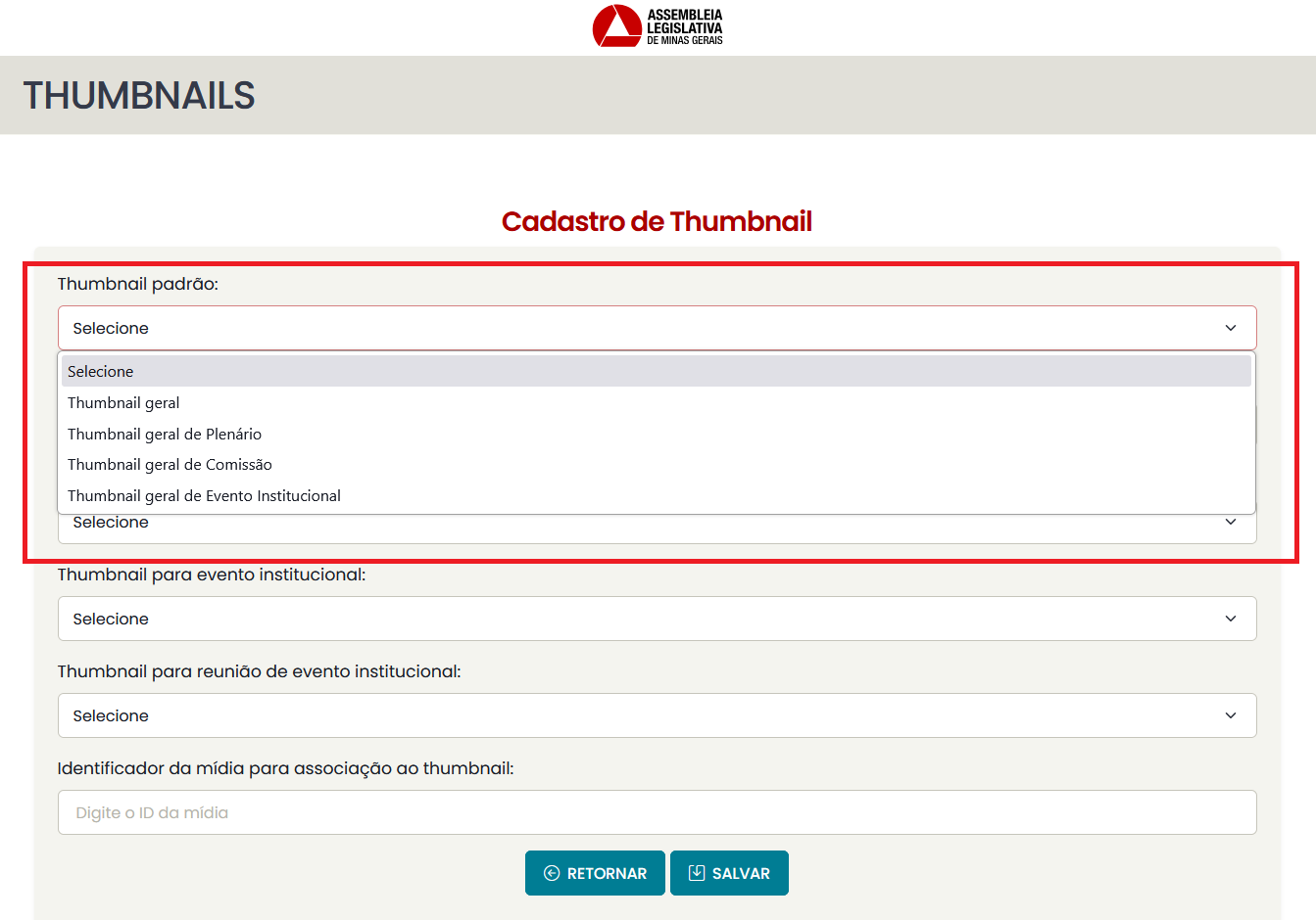 - Thumbnail geral de plenário: se cadastrada, todos os vídeos de reuniões de plenário sem uma associação específica serão associados a essa thumbnail.