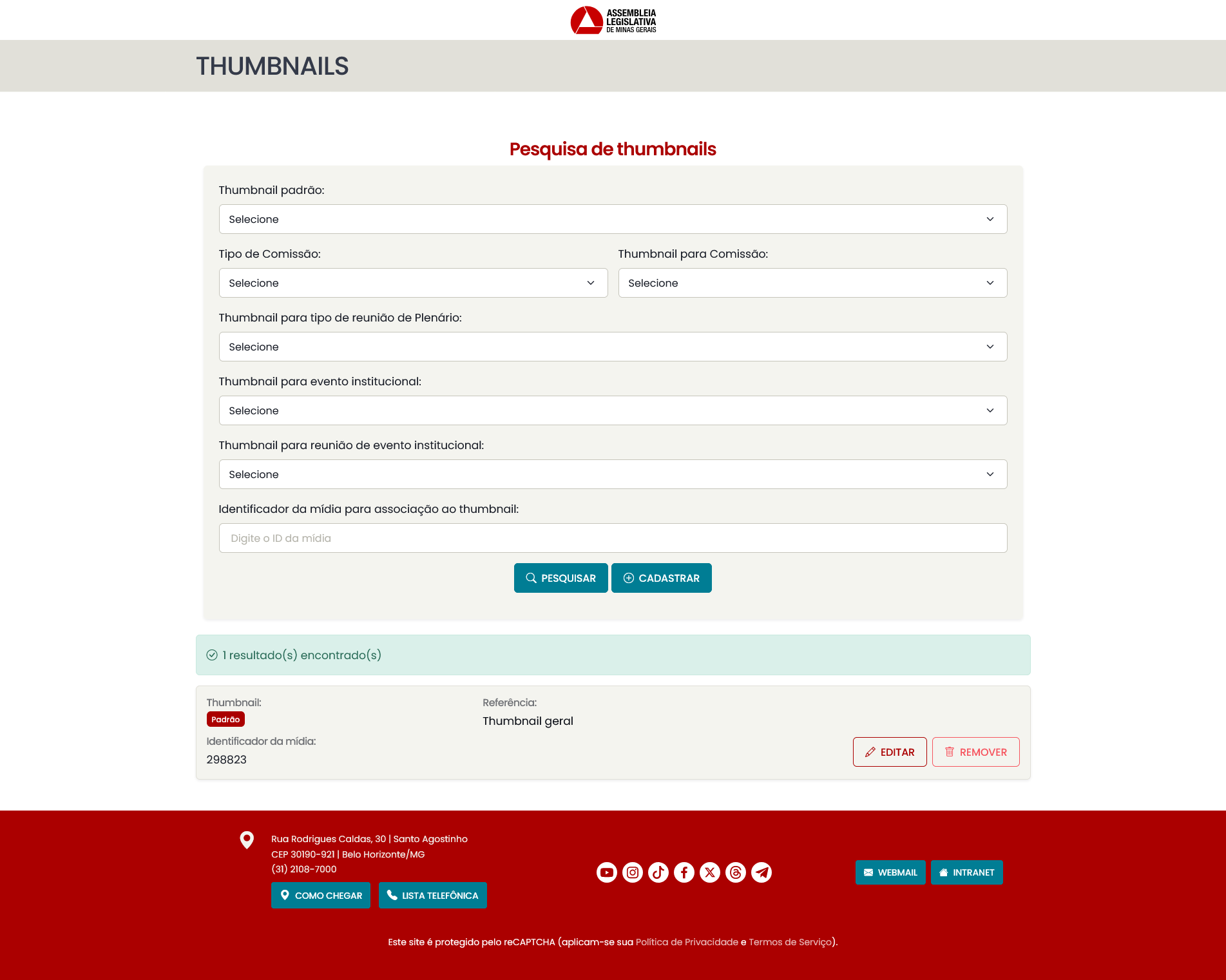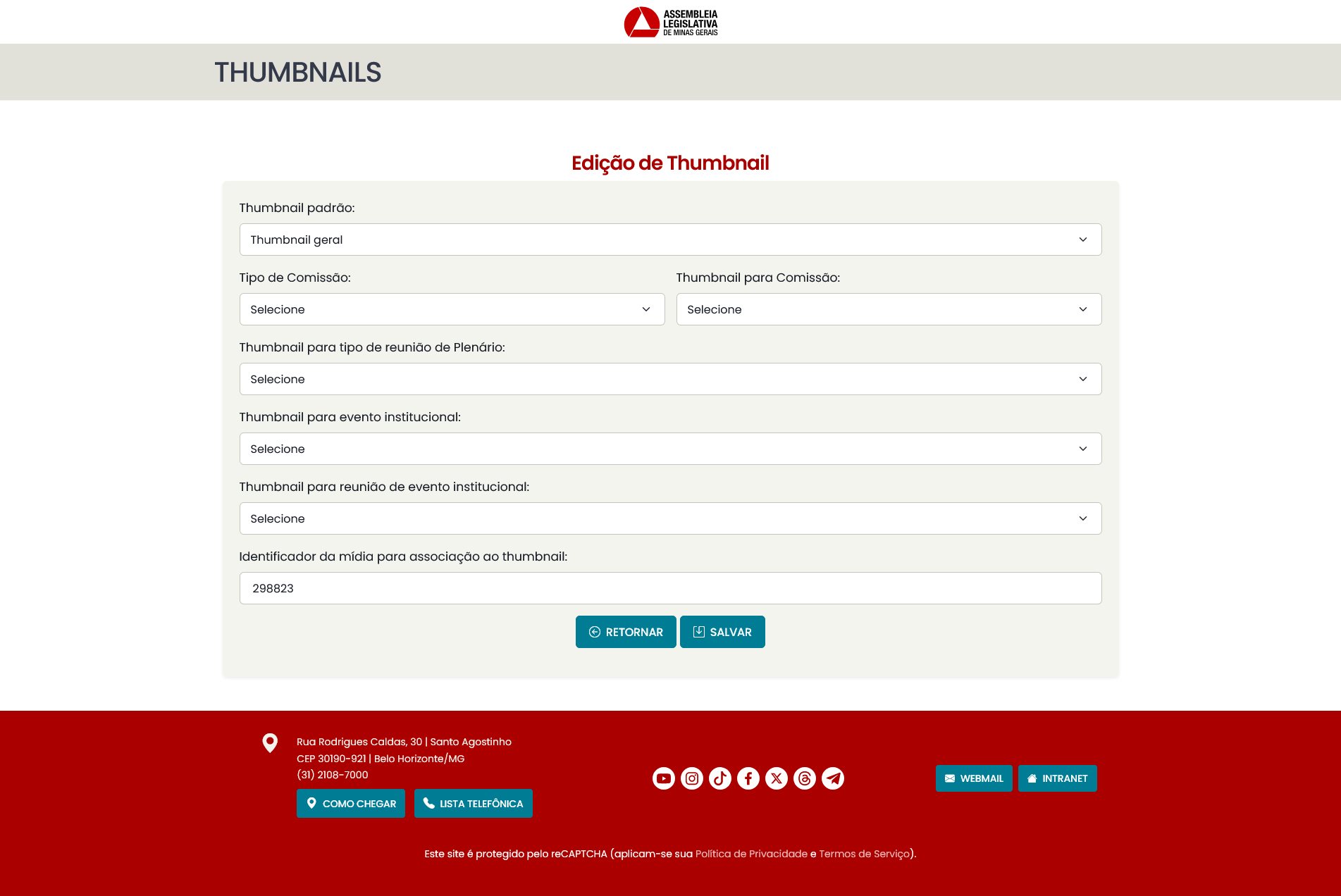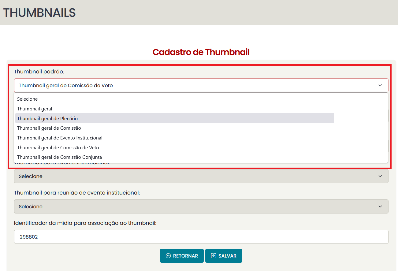 - Thumbnail geral de comissão de conjunta: se cadastrada, todos os vídeos de reuniões de comissões cujo tipo de reunião seja "conjunta" serão associadas a essa thumbnail.