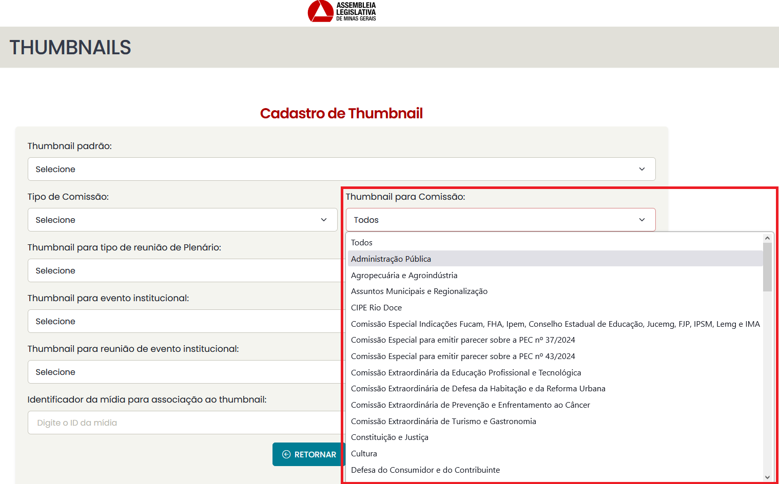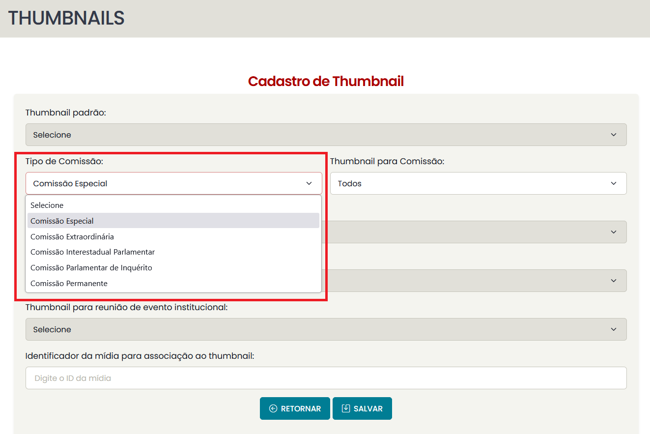 - Thumbnail geral de comissão: se cadastrada, todos os vídeos de reuniões de comissões sem uma associação específica serão associados a essa thumbnail.