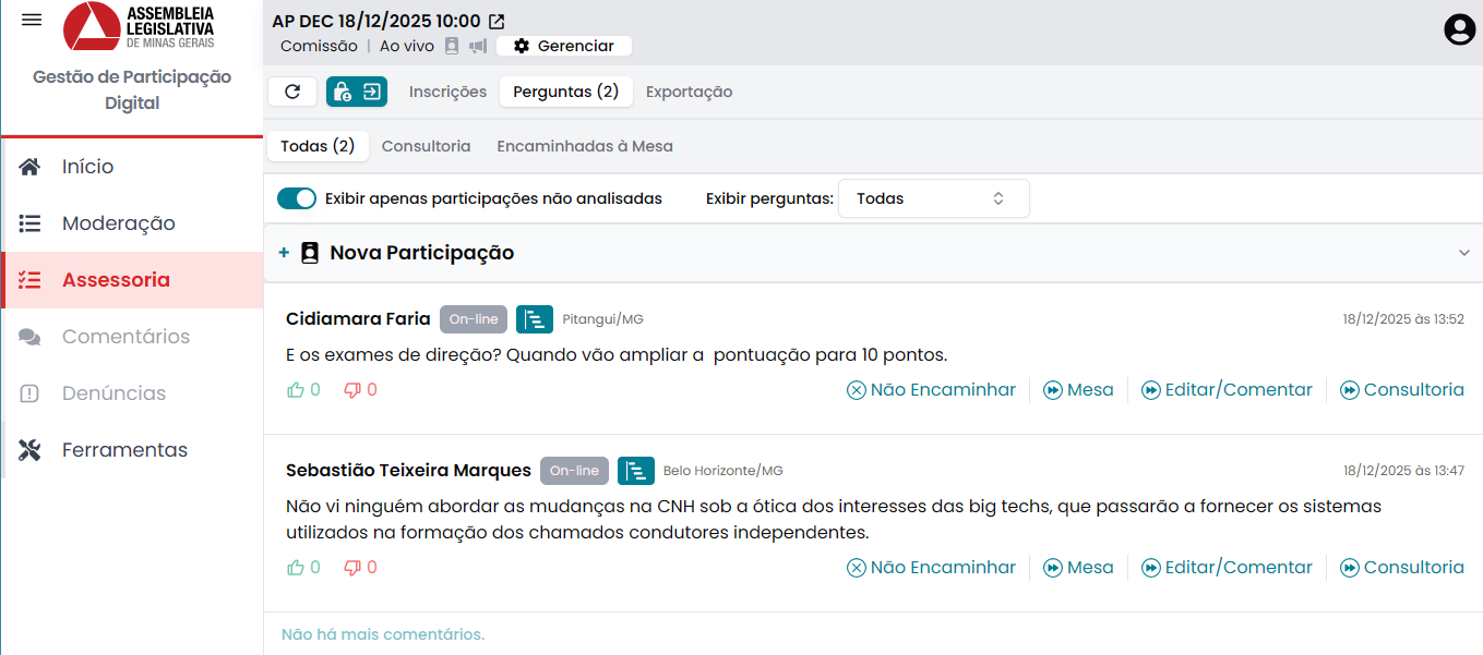 - Mesa: Encaminha a participação para a Mesa sem edição e sem comentário da assessoria. A participação é encaminhada imediatamente.